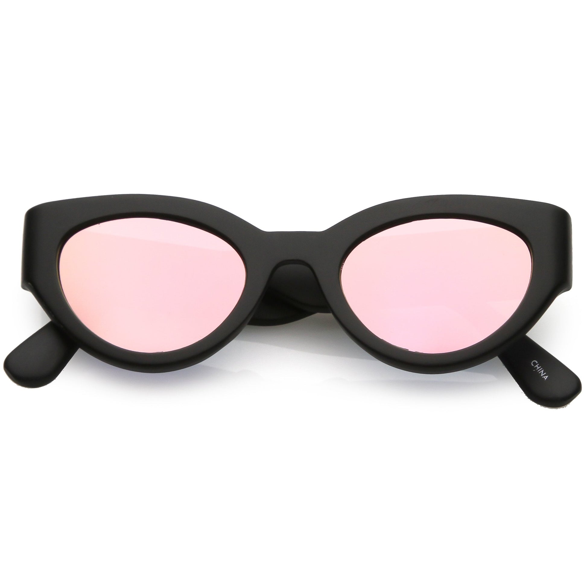 Bold cat eye sunglasses featuring a thick frame and oval flat mirrored lenses. Accented with stylishly wide arms, these cat eye sunglasses are designed in matte and shiny finishes for a variety of looks. Made with a plastic based frame, reinforced metal hinges, and 100% UV protected lenses.