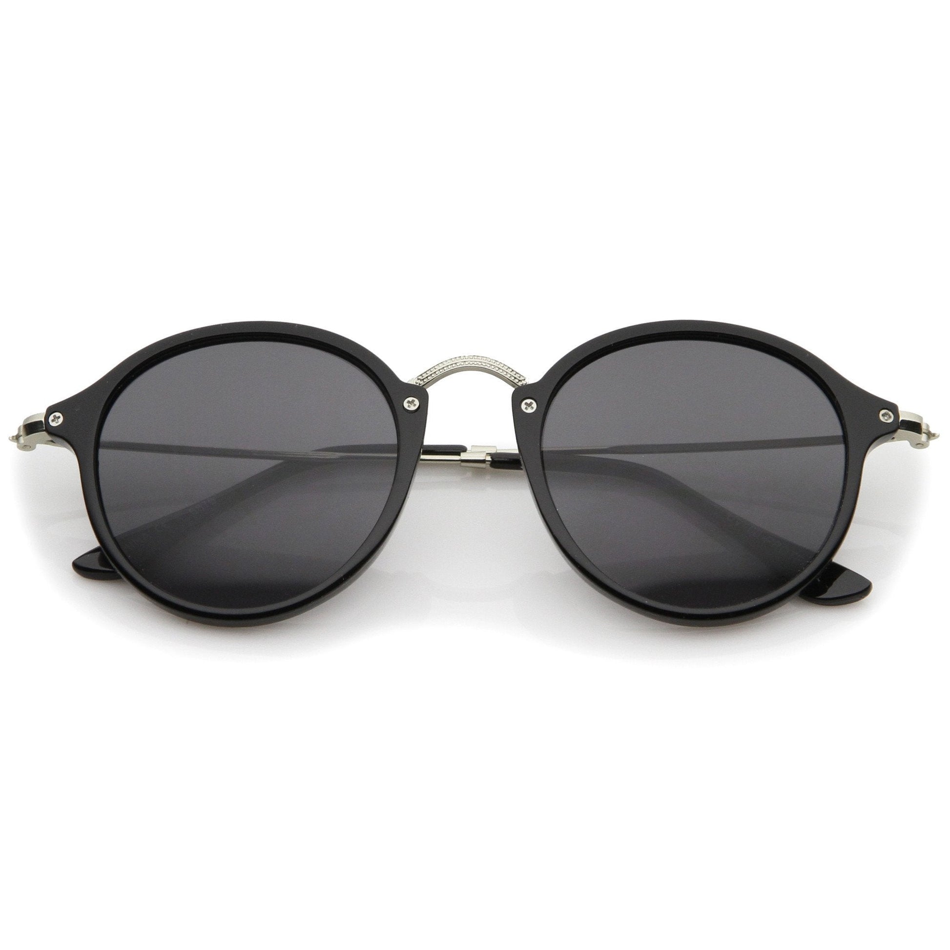 - A contemporary take on the iconic round shape, these round sunglasses feature ultra slim metal temples and an elegant metal nose bridge to give it it's lightweight appeal.Complete with neutral-colored lenses and a minimal design, these versatile sunglasses are great to wear from season to season. Made with a metal and plastic based frame, metal hinges, and polycarbonate UV400 lenses.