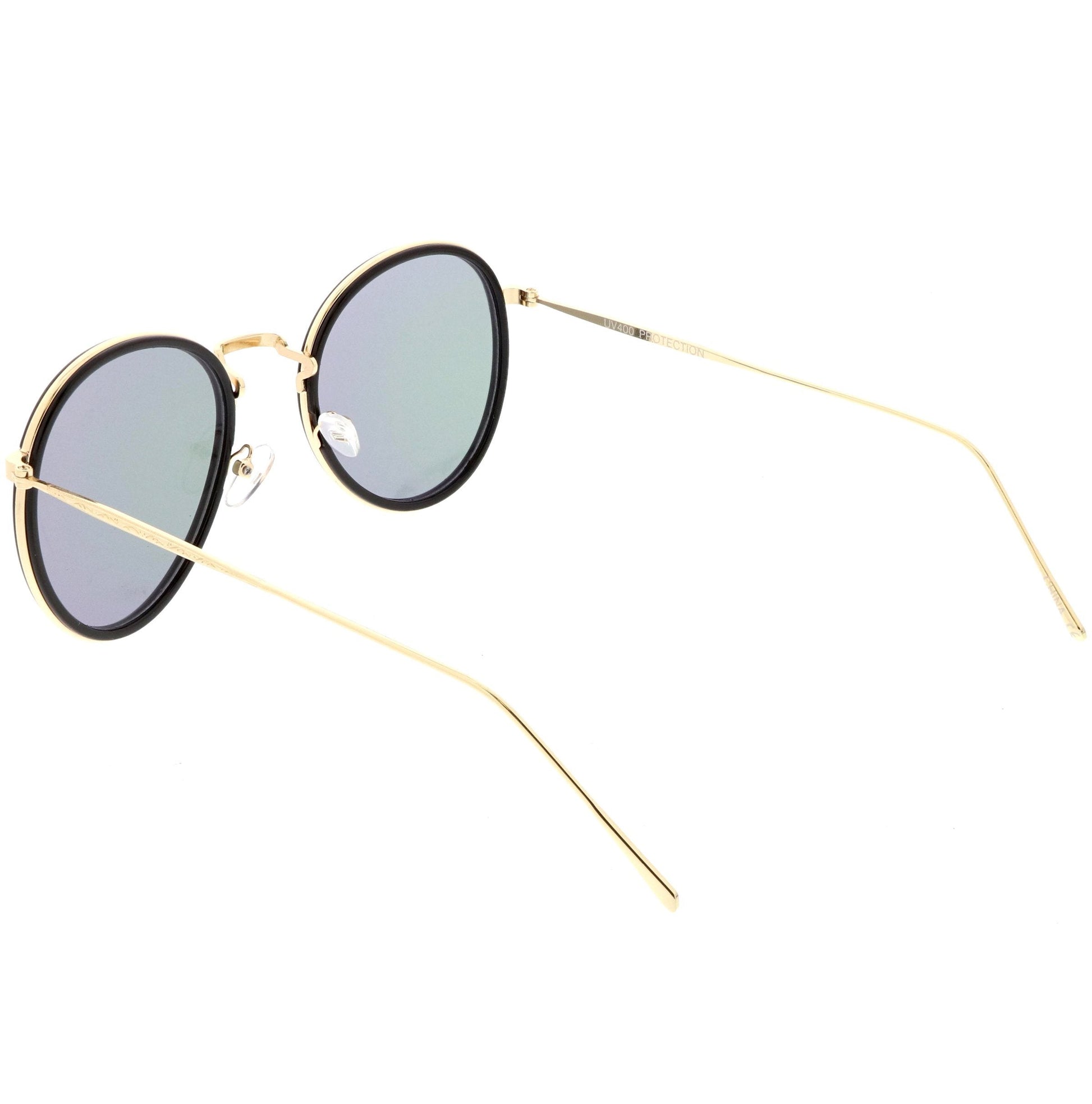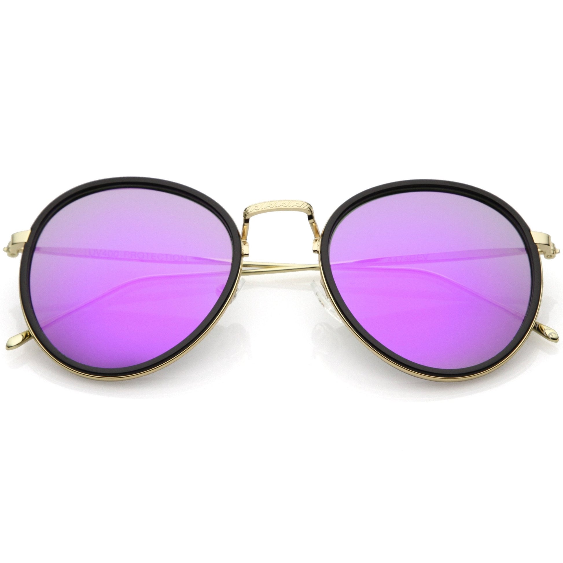 Make a bold and modern statement in these round color mirrored sunglasses. Designed with ultra slim metal arms with added engraved detail to give it a sleek and simple finish. Add this style to your accessory closet to add a little color pop. Finished with a plastic and metal based frame, adjustable English style nose pieces, metal hinges, and 100% UV protected lenses.