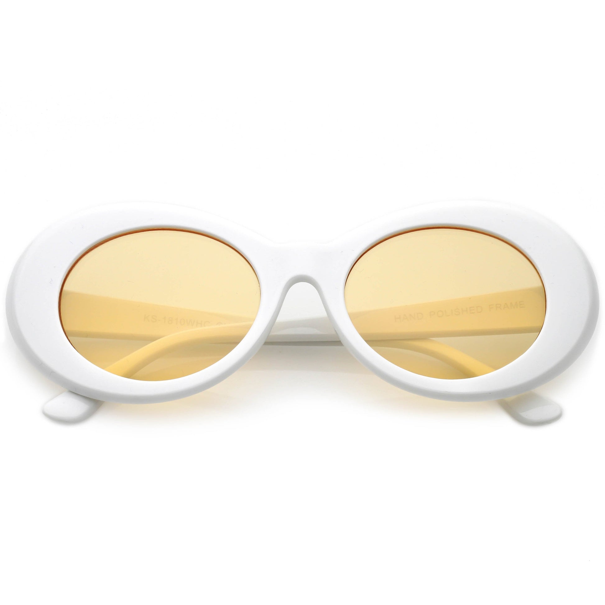 Complete your look with these retro clout goggle oval sunglasses featuring a round oval frame with fun colored lenses. Finished with arms that taper at the ends, these clout goggles will be instrumental in your music career from rock or mumble rap. Made with a plastic based frame, reinforced metal hinges, and 100% UV protected lenses.