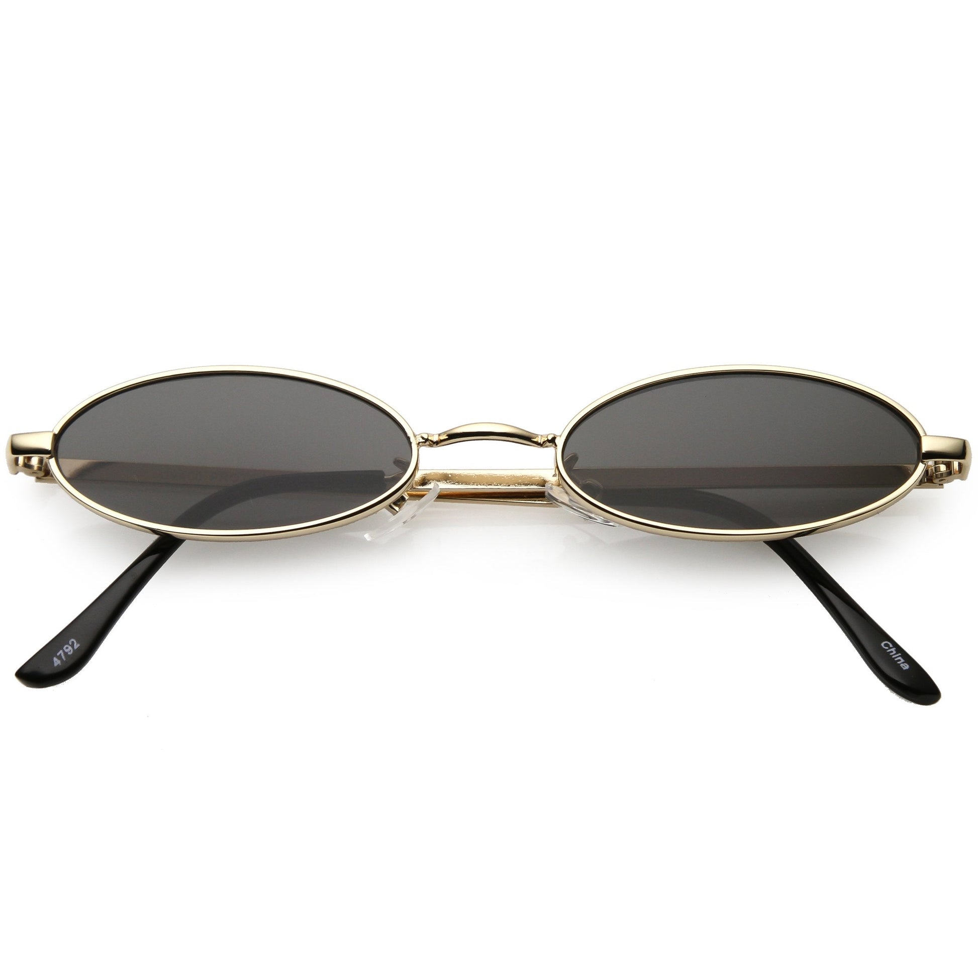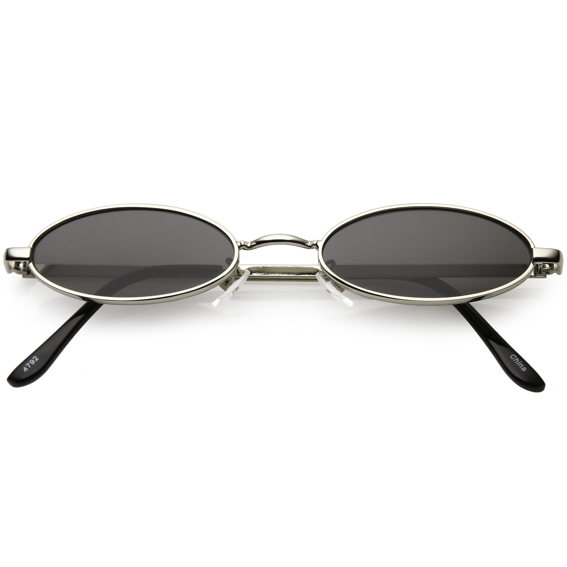 Flash back to the 90's with this classic, extremely small, oval style. Wear these celebrity must-have sunglasses with any outfit, and you'll have people doing a double take. The sleek, full metal design is made a unique nose piece and neutral colored flat lenses for some added edge. Finished with a metal-based frame, metal hinges, adjustable English style nose pieces, and 100% UV protected lenses.