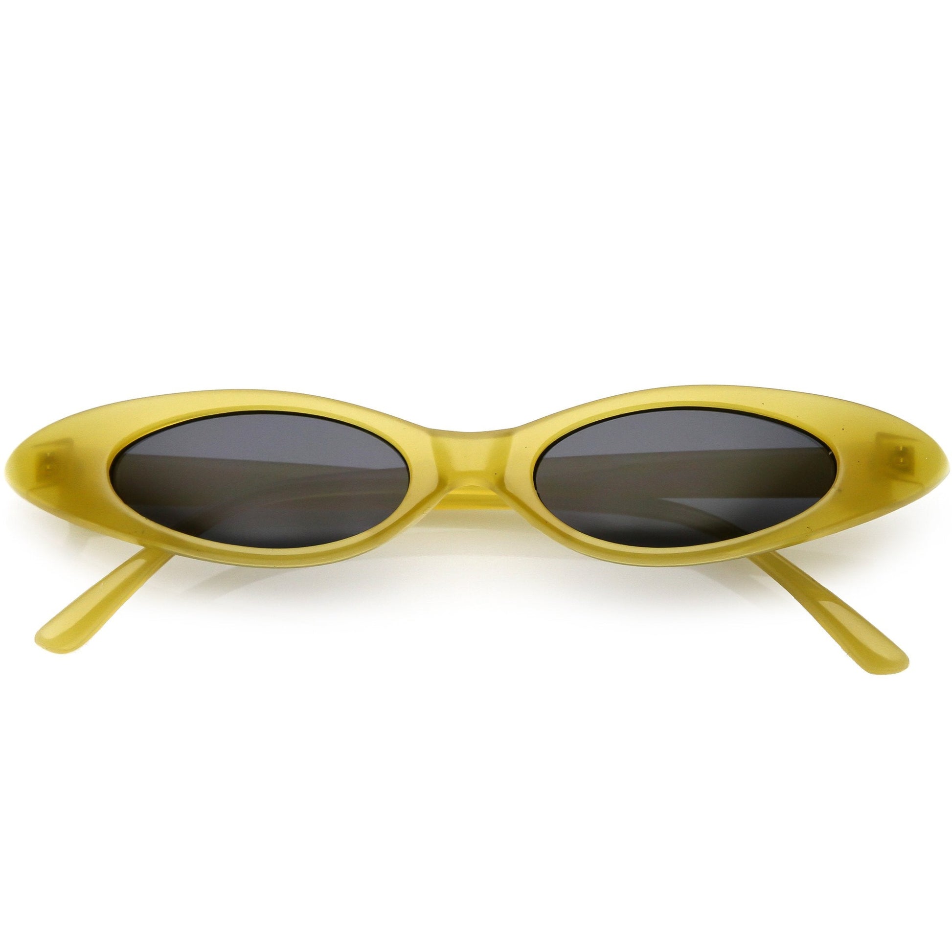 Create a bold and fun look with these retro 1990's oval sunglasses featuring a thin design in pastel hues and neutral colored oval lenses. Produced with a plastic based frame, reinforced metal hinge, and 100% UV protected lenses.