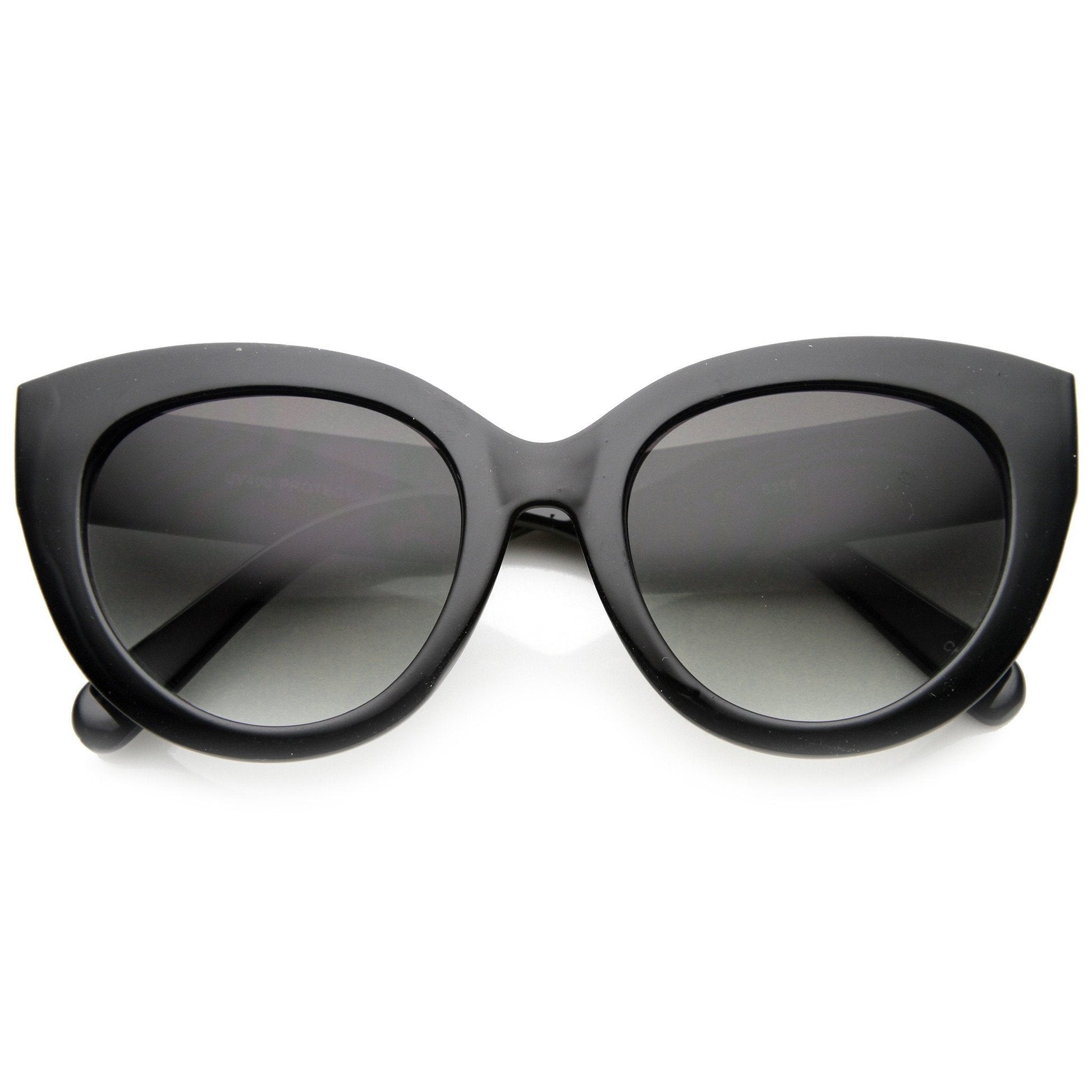 A uniquely bold and rounded oversize frame that utilizes a cat eye silhouette shape that is inspired by the bohemian chic from the '60s and '70s. Send a bold fashion statement out into the world of modern vintage glamour with these oversized cat eye sunglasses. Made with a plastic based frame, metal hinges and gradient polycarbonate UV protected lenses.