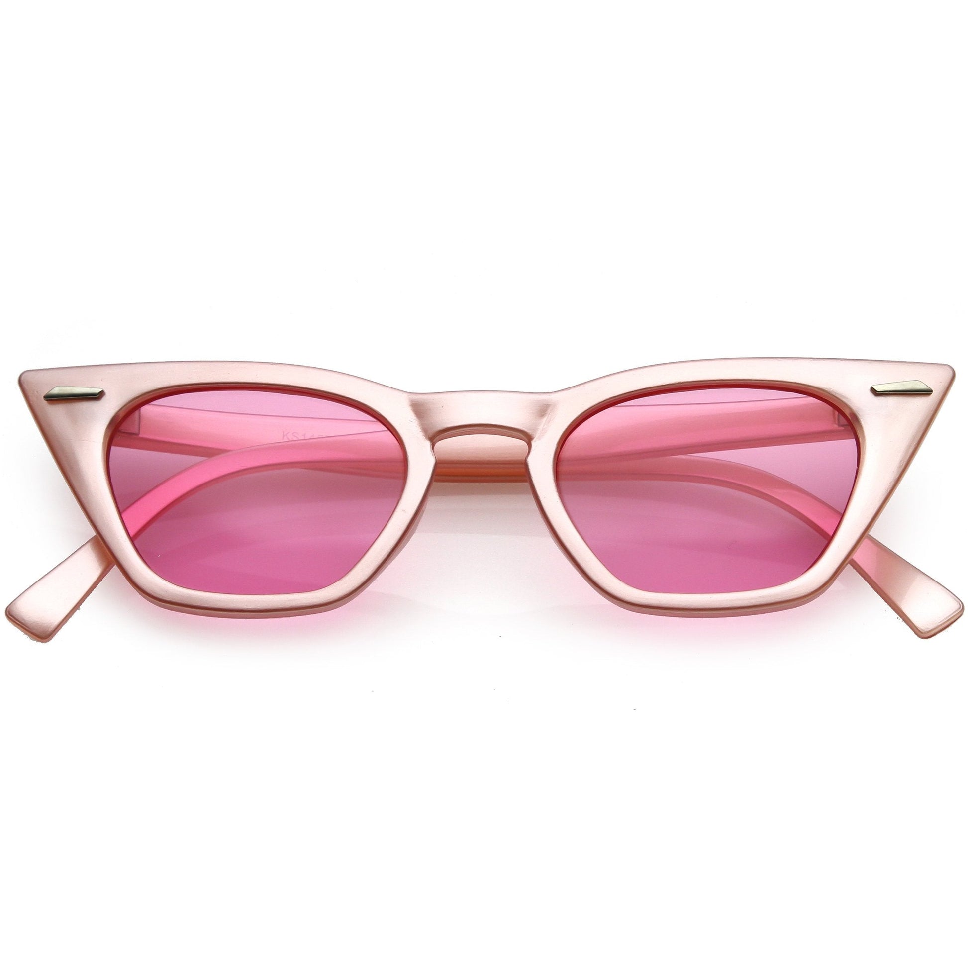 This sleek and sassy cat eye style is a must-have for any wardrobe! This unique, vintage inspired frame is perfect for those who want to add a little color to their style. These color tinted sunnies have unique metal accents that give this style a sleek finish. Completed with a plastic based frame, metal hinges, and 100% UV protected lenses.